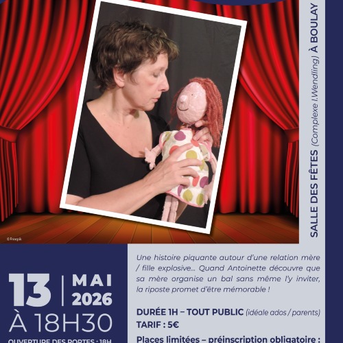 Afficher le planLa Ville de Boulay-Moselle vous propose la pièce de théâtre "Maman!" pour une soirée pleine d’émotions et d’histoires. Une histoire piquante autour d’une relation mère/fille explosive… Quand Antoinette découvre que sa mère organise un bal sans même l’y inviter, la riposte promet d’être mémorable ! Cette pièce de théâtre est parfaite pour les parents accompagnés de leurs enfants et adolescents! Ouverture des portes : 18h Début de la pièce à 18h30